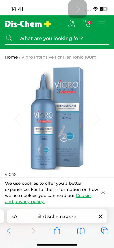 You can find the Vigro Hair Tonic and Tablets (for her) at Merlot Pharmacy, or conveniently order from Takealot or Dischem Pharmacy: